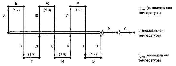 А - начать при нормальной температуре и атмосферном давлении и повышать температуру до максимума; Б - подвести испытательное давление, минимальный период удержания 1 ч, затем сбросить давление; В - снизить температуру до минимума; Г - подвести испытательное давление, минимальный период удержания 1 ч, затем сбросить давление; Д - повысить температуру до комнатной температуры; Е - подвести испытательное давление при нормальной температуре и удерживать, пока температура не поднимется до максимальной; Ж - минимальный период удержания 1 ч; З - снизить температуру до минимума при удержании испытательного давления; И - минимальный период удержания 1 ч; К - повысить температуру до комнатной при удержании испытательного давления; Л - сбросить давление, затем повысить температуру до максимальной; М - подвести испытательное давление, минимальный период удержания 1 ч, затем сбросить давление; Н - снизить температуру до минимальной; О - подвести испытательное давление, минимальный период удержания 1 ч, затем сбросить давление; П - повысить температуру до нормальной температуры; Р - подвести испытательное давление, минимальный период удержания 1 ч, затем сбросить давление; С - подвести 5 - 10 % испытательного давления, минимальный период удержания 1 ч, затем сбросить давление