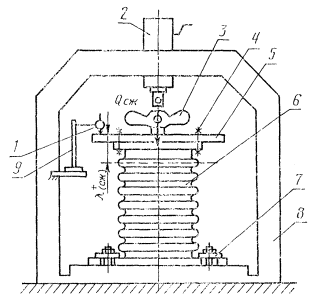 1 - индикатор; 2 - редуктор; 3 - динамометр типа ДОС; 4 - болт крепежный; 5 - балка; 6 - компенсатор сильфонный; 7 - прижим; 8 - стенд; 9 - стойка индикаторная