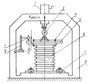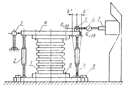 1 - индикатор; 2 - редуктор; 3 - динамометр типа ДОР; 4 - болт крепежный; 5 - балка; 6 - компенсатор сильфонный; 7 - прижим; 8 - стенд; 9 - стойка индикаторная