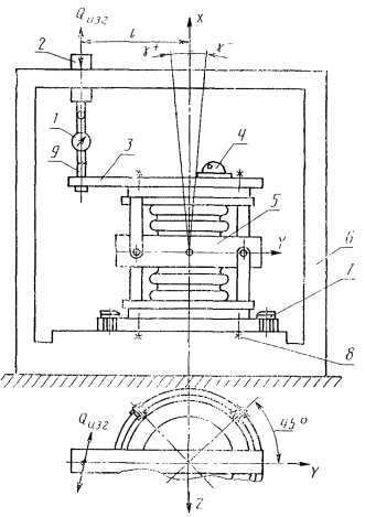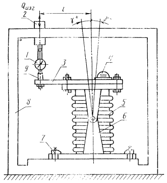 1 - динамометр; 2 - силовой орган; 3 - балка; 4 - оптический квадрант; 5 - компенсатор сильфонный; 6 - шарнир; 7 - прижим; 8 - стенд; 9 - серьга