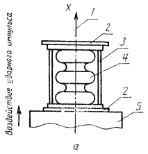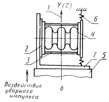 1 - ось действия ударного импульса стенда; 2 - технологические фланцы; 3 - ограничительная арматура СК, УП (при наличии); 4 - компенсатор сильфонный; 5 - грузовой стол стенда; 6 - имитатор граничных условий; 7 - оснастка