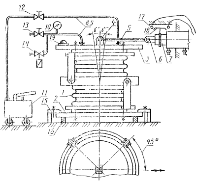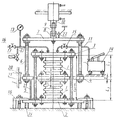 1 - компенсатор сильфонный; 2 - заглушка нижняя; 3 - заглушка верхняя; 4, 6 - серьга; 5 - переходник; 7 - шток гидроцилиндра; 8, 9 - шланг гибкий; 10 - манометр; 11 - насос; 12, 13 - клапан запорный; 14 - клапан предохранительный; 15 - прижим; 16 - подставка; 17 - выключатель конечный; 18 - планка нажимная; 19 - индикатор