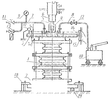 1 - компенсатор сильфонный разгруженного типа; 2 - заглушка нижняя; 3 - заглушка верхняя; 4 - серьга; 5 - переходник; 6 - шток гидроцилиндра; 7, 8 - шланг гибкий; 9 - манометр; 10 - насос; 11, 12 - клапан запорный; 13 - клапан предохранительный; 14 - подставка; 15 - выключатель конечный; 16 - планка нажимная; 17 - индикатор; 18 - прижим