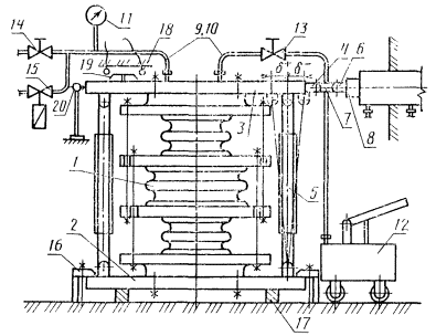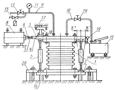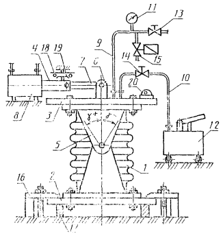1 - компенсатор сильфонный; 2 - заглушка нижняя; 3 - заглушка верхняя; 4 - шток гидроцилиндра; 5 - шарнир; 6 - вилка; 7 - переходник; 8 - привод; 9, 10 - шланг гибкий; 11 - манометр; 12 - насос; 13, 14 - клапан запорный; 15 - клапан предохранительный; 16 - прижим; 17 - подставка; 18 - выключатель конечный; 19 - планка нажимная; 20 - квадрант оптический