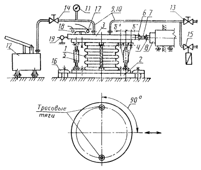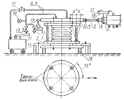 1 - компенсатор сильфонный; 2 - заглушка нижняя; 3 - заглушка верхняя; 4, 6 - серьга; 5 - талреп; 7 - переходник; 8 - шток гидроцилиндра; 9, 10 - шланг гибкий; 11 - манометр; 12 - насос; 13, 14 - клапан запорный; 15 - клапан предохранительный; 16 - прижим; 17 - выключатель конечный; 18 - планка нажимная; 19 - индикатор