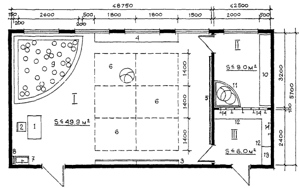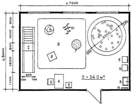 РИС. П-20. ЗАЛ ДЛЯ ГРУППОВЫХ ЗАНЯТИЙ ЛФК С КЛАДОВОЙ И РАЗДЕВАЛКОЙ