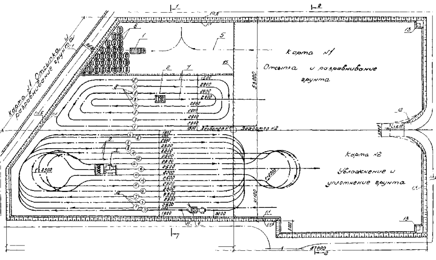 Вся площадь котлована разбивается на две захватки, каждая из которых на две карты. На каждой из карт, в технологической последовательности чередуются операции: