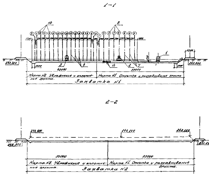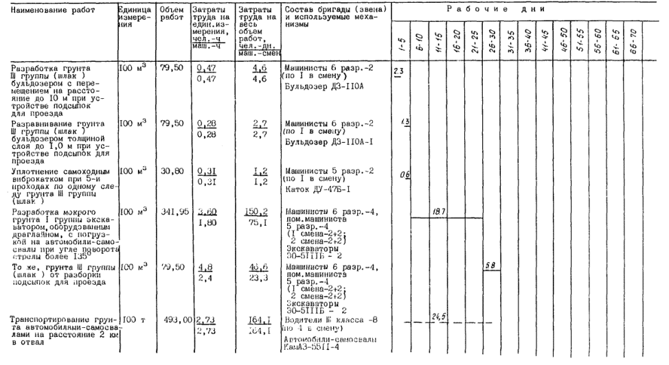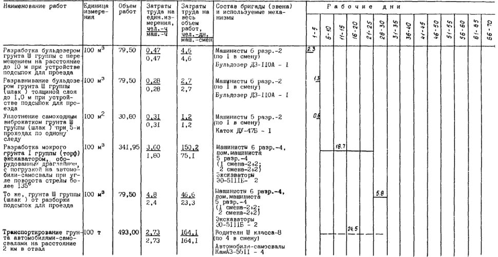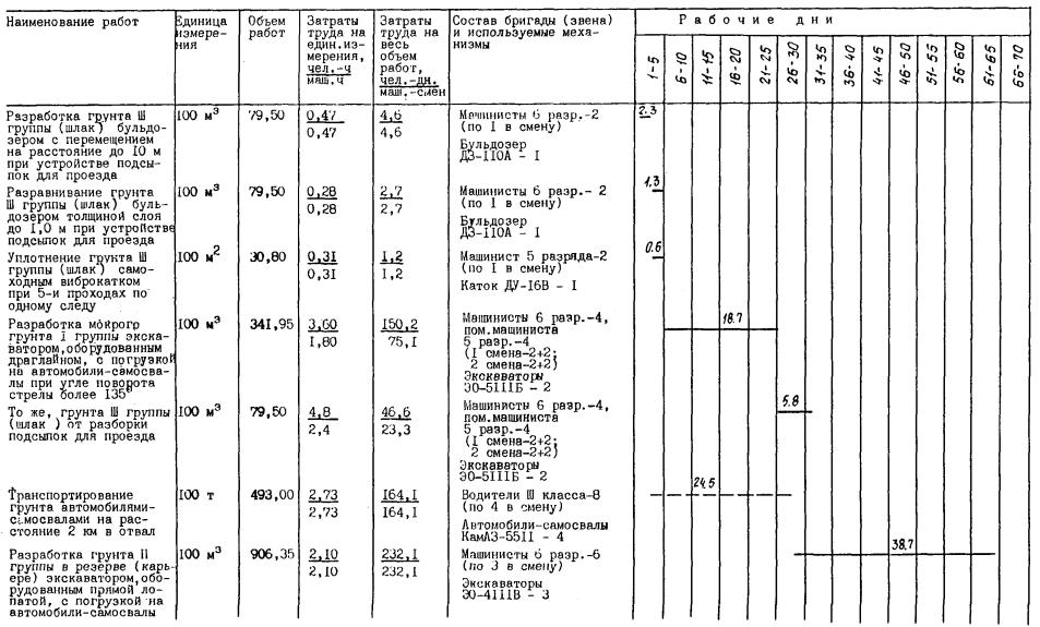Автодороги и подсыпки шириной 5,50 м и высотой 0,50 м устраиваются из доменного шлака или другого местного строительного материала над поверхностью земли. Привезенный автомобилями-самосвалами шлак отсыпается «с головы», разравнивается бульдозером ДЗ-110А и уплотняется катком ДУ-47Б.