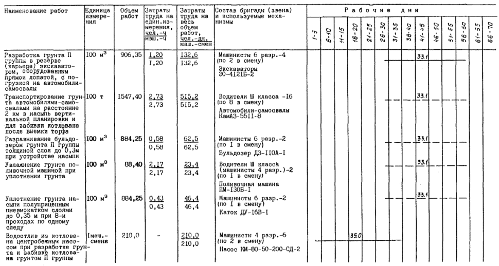 устройство подсыпок для проездов механизмов и автотранспорта и автодороги по контуру планировки; выемка торфа; водоотлив; разработка грунта в резерве (карьере); забивка котлована после выемки торфа грунтом II группы; возведение планировочной насыпи.