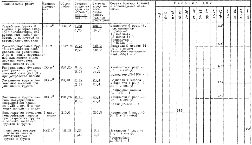 Экскаватор Э0-4111В прямая лопата. Автомобиль-самосвал КамАЗ-5511. Бульдозер ДЗ-110А. Каток ДУ-16В. Поливочная машина ПМ-130Б. Автогрейдер ДЗ-31-1. Насос КМ80-50-200-СД |
