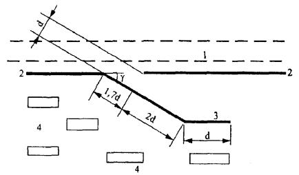 Левый отгон должен быть расположен под углом примерно 50° к оси основной части экрана так, чтобы не пересекать трассы прохождения силового электрического кабеля, и иметь длину Lбок.лев. = 100 м.
