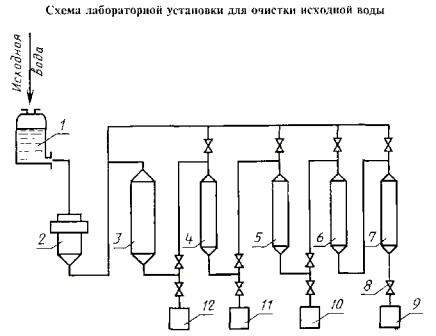 Принципиальная схема лабораторной установки для очистки исходной воды (черт. 1) состоит из последовательно соединенных между собой фильтров: фильтра грубой очистки, предназначенного для отделения взвешенных частиц; фильтра для отделения органических веществ; H-катионитовых фильтров; анионитового фильтра, комбинированного (катионито-анионитового) фильтра, а также бутылей (канистр) для исходной и очищенной воды на различных стадиях очистки. Схема установки для очистки исходной воды предусматривает возможность регенерации или замены любого из фильтров независимо друг от друга.