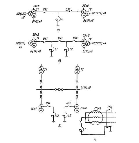 а - включение одного реактора; б - включение двух реакторов; в - включение реакторов в нейтрали трансформаторов СН; г - включение реактора в нейтраль генератора (синхронного компенсатора)
