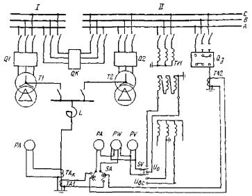 Переключатель тока SA должен быть устроен так, чтобы при включении токовой обмотки ваттметра и амперметра в цепь одного трансформатора тока второй трансформатор тока закорачивался. При наличии двух комплектов приборов переключатель тока не требуется.