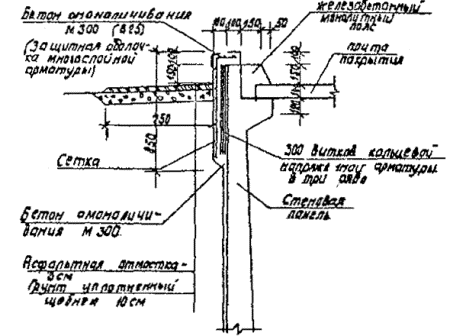 Стенка сборная, выполнена из панелей. Применяемый бетон М-200 повышенной плотности. Стеновые панели изготовлены предварительно напряженными. Они имеют в верхней части с внутренней стороны консоль для опирания крайнего ряда плит покрытия. С наружной стороны - панели криволинейного очертания по радиусу резервуара. Стеновые панели соединены между собой путем сварки выпусков поперечной арматуры диаметром 10 мм через 1 м по высоте и замоноличивания.