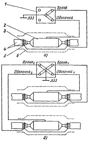Рис. 3. Схема соединений кабеля, имеющего изолирующие покровы типов Б, Бл, Б2л, с устройством электрохимической защиты: