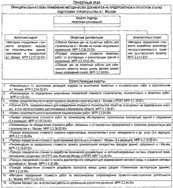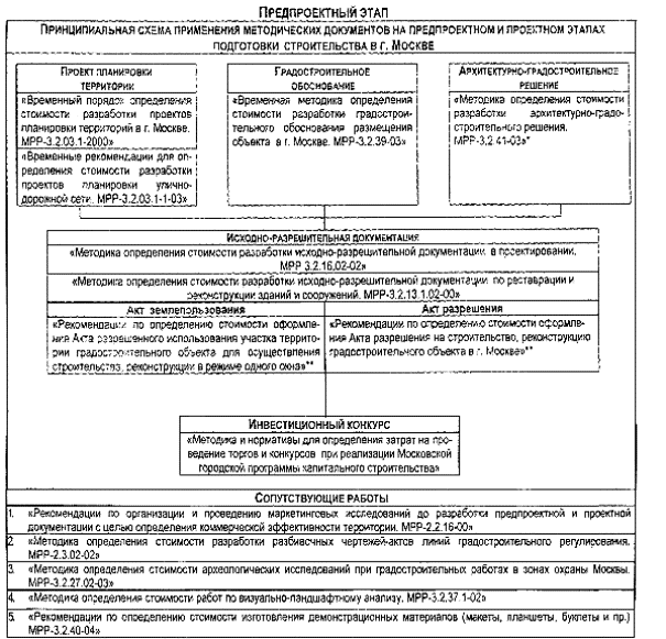 2.4. Взаимосвязь основных видов предпроектной и проектной документации с методическими документами по ценообразованию в проектном комплексе отражена в «Принципиальной схеме применения методических документов по ценообразованию на предпроектном и проектном этапах подготовки строительства в г. Москве» (приложение 2).
