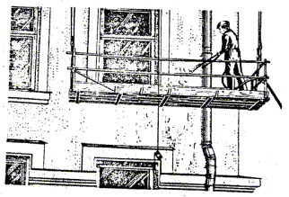Люлька самоподъемная конструкции Мосжилуправления. Люлька подвешивается на двух металлических канатах. Подъем и опускание производится двумя ручными лебедками. Каркас люльки изготовлен из полосовой стали, настил деревянный, ограждение трубчатое. Лебедки имеют зубчатые передачи и безопасные рукоятки с храповыми собачками. Для облегчения перемещения вдоль фасадов зданий люльки оборудуются роликами или колесами диам. 100 - 150 мм. |