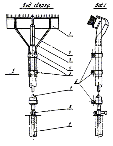 1 - щетка, 2 - шланг Æ 8 l = 120 мм, 3 - оправа, 4 - рукоятка, 5 - хомутик, 6 - болт М6´30, 7 - трубка, 8 - кран запорный, 9 - шланг Æ 9.