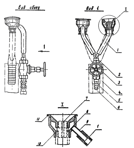 Гидросопло с приспособлением ЛНИИ АКХ. Гидросопло имеет патрубок из газовой трубы диаметром 25 мм, на нижнем конце которого находится штуцер для присоединения материального шланга, по которому подается песок. В верхней части патрубка с помощью электросварки приварены два наконечника (рожка) из газовой трубы диаметром 19 мм с установленными на них соплами. Насадка сопла с помощью распылителя плотно прижата к резиновой уплотнительной шайбе, находящейся на конце штуцера. По конической поверхности распылителя высверлены отверстия для выбрасывания струи воды при работе гидросопла. |
