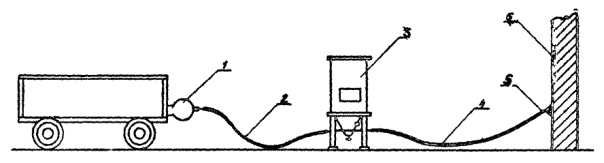 1 - компрессор, 2 - шланг диаметром 25 мм, 3 - пескоструйный аппарат, 4 - шланг диаметром 32 мм, 5 - сопло, 6 - обрабатываемая поверхность.