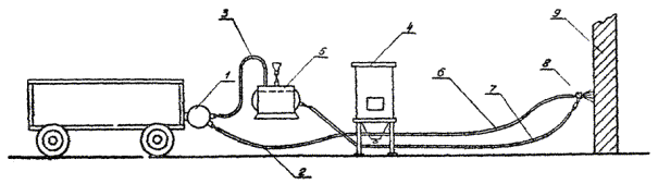 1 - компрессор, 2 - шланг диаметром 25 мм, 3 - шланг диаметром 15 мм, 4 - пескоструйный аппарат, 5 - бак с водой, 6 - шланг диаметром 32 мм, 7 - шланг диаметром 16 мм, 8 - сопла, 9 - обрабатываемая поверхность.