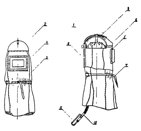 1 - каркас, 2 - головная часть шлема, 3 - пелерина, 4 - рамка со смотровым стеклом; 5 - рамка, 6 - скоба, 7 - наплечный ремень, 8 - воздухораспределитель, 9 - воздушный шланг, 10 - штуцер воздушного шланга, 11 - поясной крючок.
