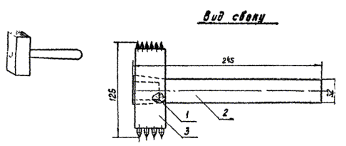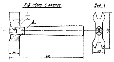 1 - клин; 2 - ручка (древесина твердой породы, проолифлена, отшлифована и покрыта лаком); 3 - корпус (на 1/6 длины термически обработан HRC = 46 ¸ 52, оксидирован).