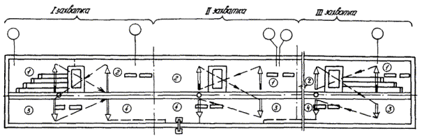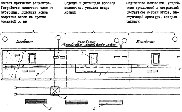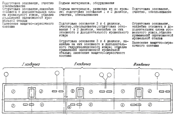 Кровельные работы ведут навстречу подаче материалов на 1-ой захватке, затем на 3-ей и 2-ой захватках (рис. 2).