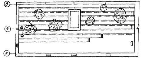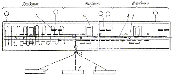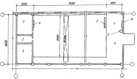 1 - вентшахты; 2 - машинное отделение; 3 - ендова; 4 - водоприемная воронка; 5 - склад материалов; 6 - крышевой стреловой кран
