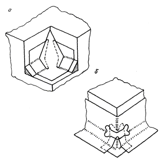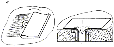 Дополнительный слой рулонного ковра у водоприемной воронки наклеивают в такой последовательности: выкраивают полотнище рулонного полимерного материала размером 1000×1000 мм, грунтуют его приклеивающей мастикой, подсушивают и укладывают на основание симметрично оси воронки; отгибают половину полотнища, наносят шпателем или кистью сплошным слоем приклеивающую мастику на основание (рис. 3, а), затем возвращают полотнище на место; аналогично приклеивают вторую половину полотнища, после чего тщательно притирают или прикатывают ручным катком типа ИР-735. Над воронкой симметрично ее оси делают крестообразный разрез 150×150 мм; края разреза прижимают к внутренней поверхности воронки, на которую предварительно был нанесен слой мастики (рис. 3, б).