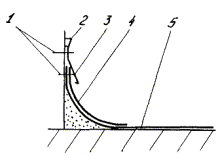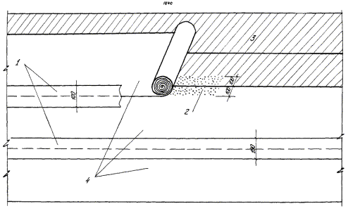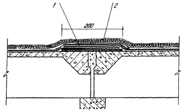 1 - полосовые прокладки; 2 - мастика; 3 - подстилающий слой из пергамина; 4 - полотнища армогидробутила