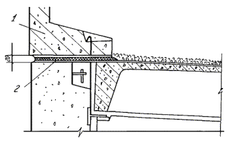 Дополнительный слой кровельного материала в местах примыкания к вертикальным конструкциям наклеивают целым полотнищем перпендикулярно основному ковру с напуском на основание не менее 100 мм, закрепляют в верхней части вместе с основным ковром и защищают металлическим фартуком (рис. 9).
