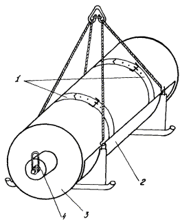 После склейки гидроизоляционного слоя кровельщик 1 валиком наносит мастику на швы нахлестки полотнищ армогидробутила, кровельщик 2 раскатывает и приклеивает заранее заготовленные ленты из армогидробутила шириной 100 мм, а кровельщик 3 прикатывает их катком. После этого ковер наматывают с помощью намоточного устройства на кассету - траверсу и маркируют (рис. 4).