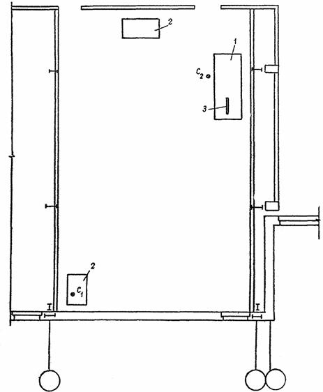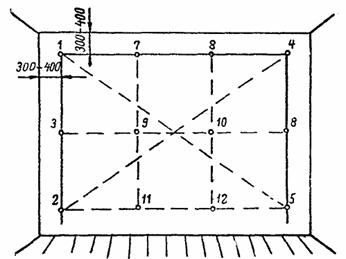 Столяр С1, стоя на подмостях в верхнем углу, на расстоянии 30 - 40 см от лузга стены и потолка, закрепляет гвоздь, с которого спускает шнур с отвесом; столяр С2, стоя на полу, закрепляет внизу по отвесу второй гвоздь на расстоянии 20 - 30 см от пола. К гвоздям привязывает туго натянутый шнур и посередине его закрепляет еще один гвоздь. То же самое делают у другого угла стены и между гвоздями одной и другой стороны натягивают шнуры по горизонтали. По этим шнурам также закрепляют промежуточные гвозди; затем натягивают шнуры по диагоналям стены. Высота гвоздей показывает, где на стене имеются выступы и углубления. Один из максимальных выступов принимают за контрольный и по нему выравнивают высоту гвоздей (рис. 1).