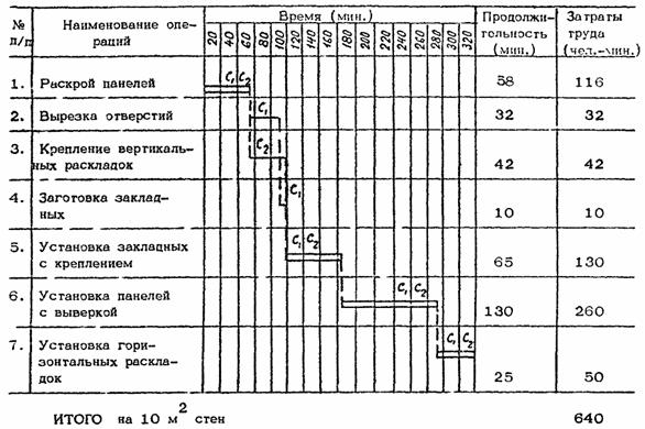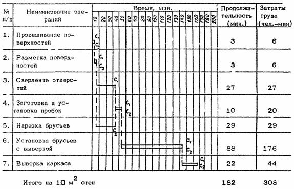 Разметка поверхностей; 3 мин.; С1, С2; метр, рейка, подмости. Столяры С1 и С2 производят разметку стен при помощи метра и рейки для установки пробок (по 3 - 4 отметки под каждый вертикальный брус и по 2 отметки под каждый горизонтальный брус).