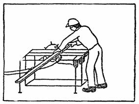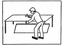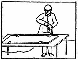 Столяр С2 производит нарезку раскладок (деревянных реек шириной 10 мм) ножовкой, предварительно разметив их по заданным размерам, затем крепит раскладки к торцу панели гвоздями с шагом 20 - 25 см (рис. 2).