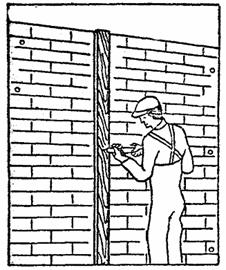 Столяры С1 и С2 устанавливают вертикальные бруски с шагом 50 - 60 см (в зависимости от ширины панели) и крепят их к пробкам шурупами (рис. 3). Установленные брусья выверяют по отвесу; если имеются отклонения по вертикали, то под брусья (около пробок) подкладывают деревянные клинья требуемой толщины и крепят их к брусьям гвоздями. После установки вертикальных брусьев между ними устанавливают горизонтальные брусья и крепят их шурупами к пробкам (рис. 4).