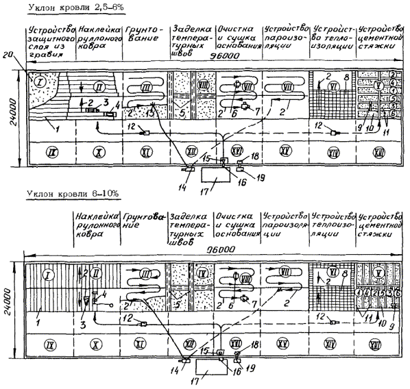 В зависимости от вида гидроизоляционного ковра в схемах даны следующие варианты устройства кровли: из рулонных традиционных материалов, наплавляемого рубероида (холодным и горячим способом), битумных эмульсий катионного и анионного типа, битумных и битумно-полимерных мастик на твердых эмульгаторах.