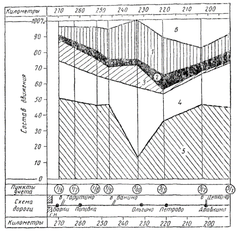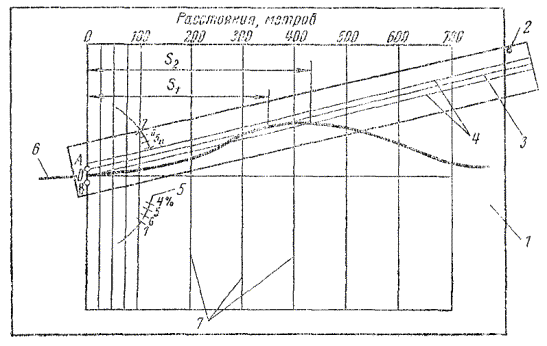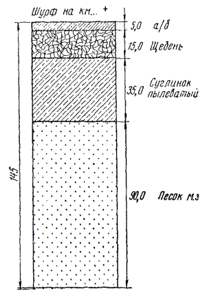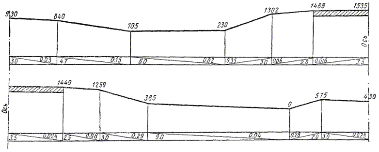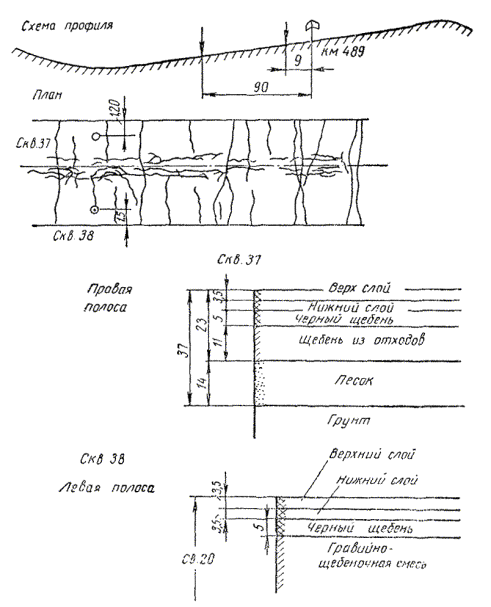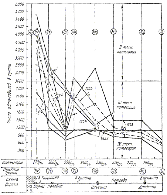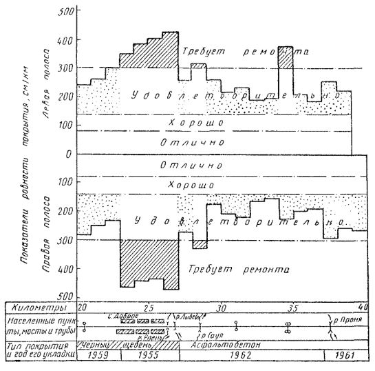 Для большей наглядности собранные сведения наносятся на линейный график дороги (рис. 1). Анализ этого графика позволяет составить полное предварительное представление о дороге и наметить места детальных обследований.