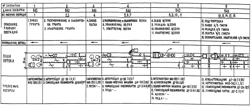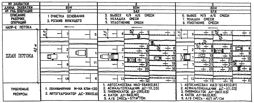 В соответствии с заданной конструкцией покрытия и технологией производства работ для ее возведения устанавливают необходимый состав, специализированных потоков. Минимальный темп потока определяется, как правило, исходя из директивного или нормативного сроков строительства. В пределах директивного срока строительства необходимо определить возможное начало и окончание работ, т.е. продолжительность строительного сезона по климатическим условиям.