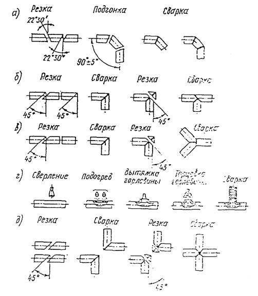 фаски обратной стороной развертки; г) установка накидной гайки и соединительной