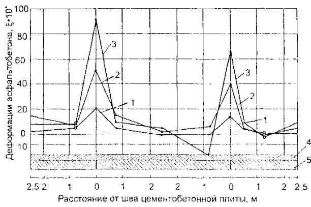 1 - при понижении температуры от +15° до +10°С; 2 - при понижении температуры до -1°С; 3 - при понижении температуры до -15°С; 4 - асфальтобетонное покрытие; 5 - существующее цементобетонное покрытие