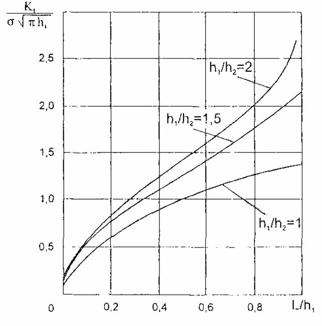 Рис. 3.2. Влияние отношения толщин слоев цементобетона (h1) и асфальтобетона (h2) на коэффициент интенсивности напряжений (К1): L -длина трещины; а - напряжение; Е1 = 35000 МПа.; Е2 = 1000 МПа ; Е3 = 35 МПа