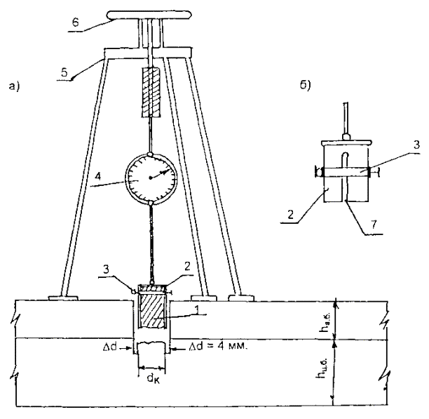 Рис. 6.1. Схема установки для определения сцепления слоя асфальтобетона с основанием (а) и разжимного стакана (б) для керна: