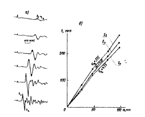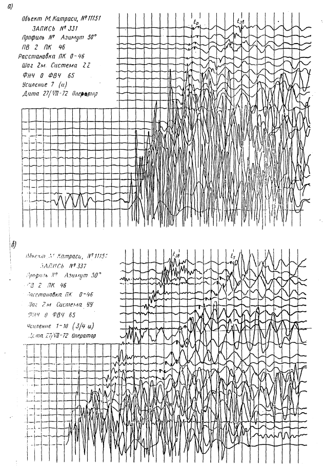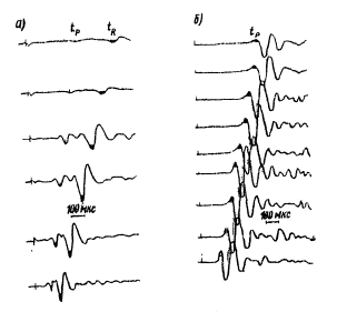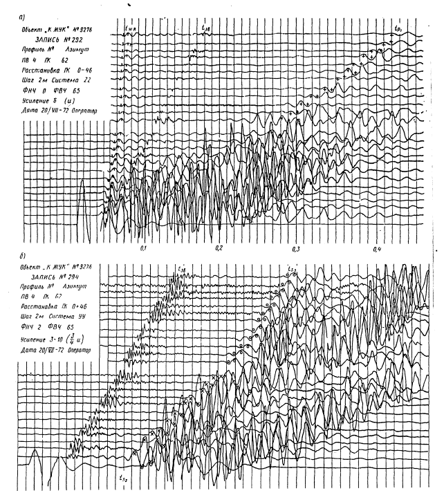 Рис. 8. Характер записи продольных (в) и поперечных (б) волн, связанных со слоями ниже УГВ рыхлые грунты, г. Чебоксары)