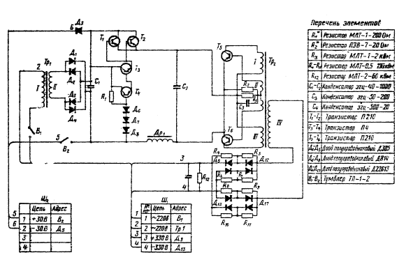 При питании от аккумуляторов тумблер В1 выключен, а В2 включен. Постоянное напряжение 24 В от аккумуляторов подают на контакты 1-2 разъема III2, а на выходе постоянное напряжение 330 В, как и в первом случае, снимают с контактов 3-4 разъема III1. Характеристика трансформаторов Tр1 и Тр2, дросселя Др1 приведена в таблице.