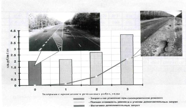 Рис.1. Рост дополнительных затрат на капитальный ремонт с учётом задержек проведения ремонтных работ (данные Дирекции Дороги России)
