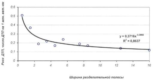 Рис. 6. Зависимость риска ДТП от ширины и наличия