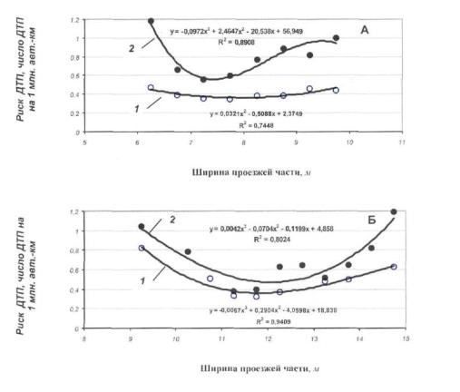 Таким образом, в результате исследований влияния параметров поперечного профиля автомобильных дорог на риск ДТП установлен ряд новых статистических зависимостей этого влияния. Они могут быть использованы для решения ряда практических задач, связанных с нормированием параметров элементов поперечного профиля по критерию сокращения риска ДТП, назначением и оценкой эффективности мероприятий по повышению безопасности дорожного движения.